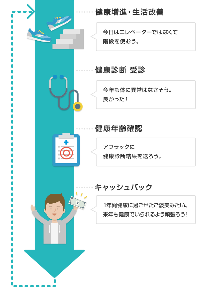 ご契約後、1年に1回健康診断の結果によって健康還付金(キャッシュバック)の支払を判定します。アプリをご利用いただくと簡単に請求いただけます。